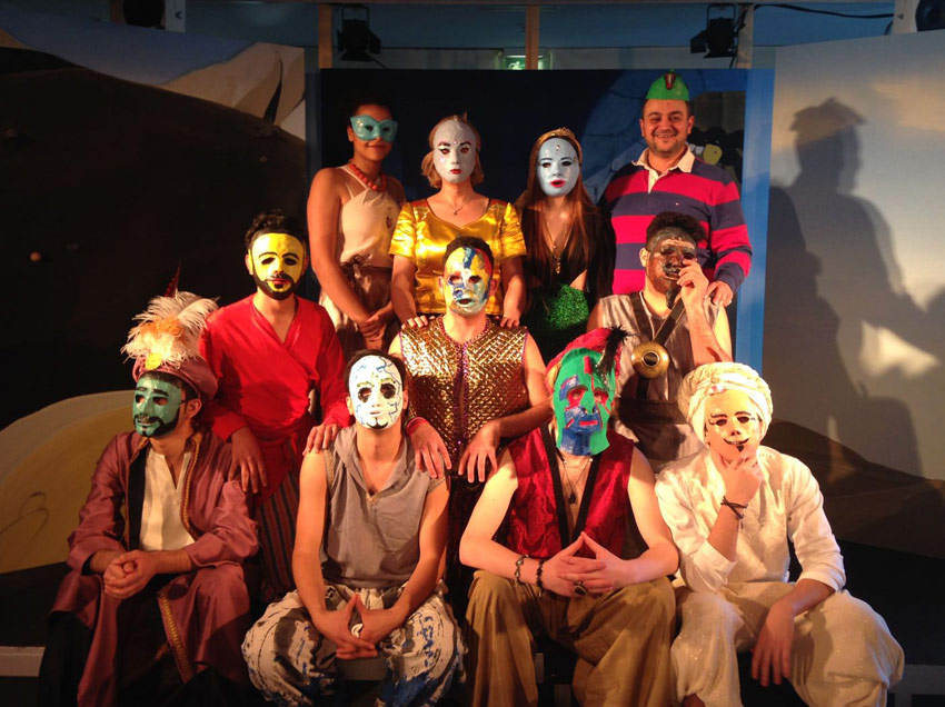 Die Geschichte von Aladin, dem Dieb von Bagdad, ist die meisterzählte in arabischer Sprache. Aladin überlistet den bösen Zauberer, hält sich einen mächtigen Flaschengeist, heiratet die wunderschöne Tochter des Sultans und fliegt mir ihr und seinem prachtvollen Palast in den Sonnenaufgang. Jugendliche aus Syrien, Afghanistan, Ägypten, Schweden und Deutschland spielen und erzählen diese wundersame Geschichte für Menschen ab 6 Jahren unter Anleitung des irakischen Regisseurs Ammar Alqaisi. Ein Maskenworkshop von Sylvia Janka im Rahmen des Welcome Cafés bildete den Ausgangspunkt für dieses interkulturelle Theaterprojekt (Fotos).